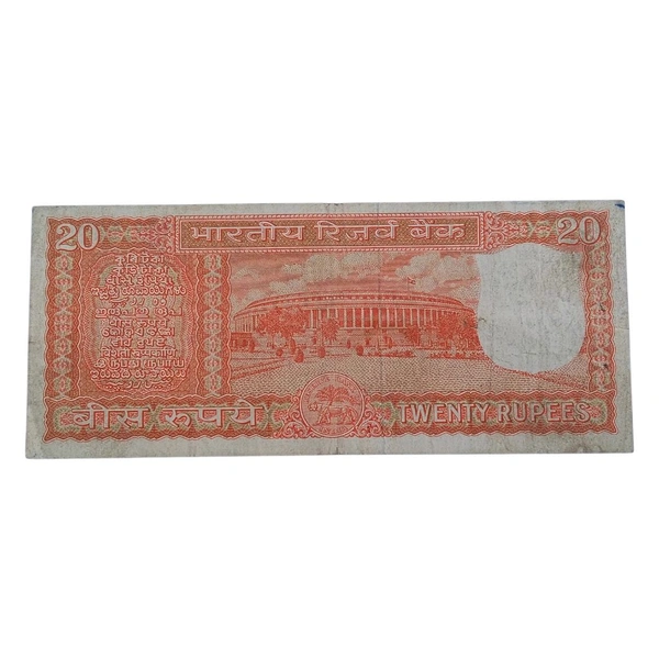 India's seal on the right. The number 20 is large in the middle. Serial number on top right and bottom left.